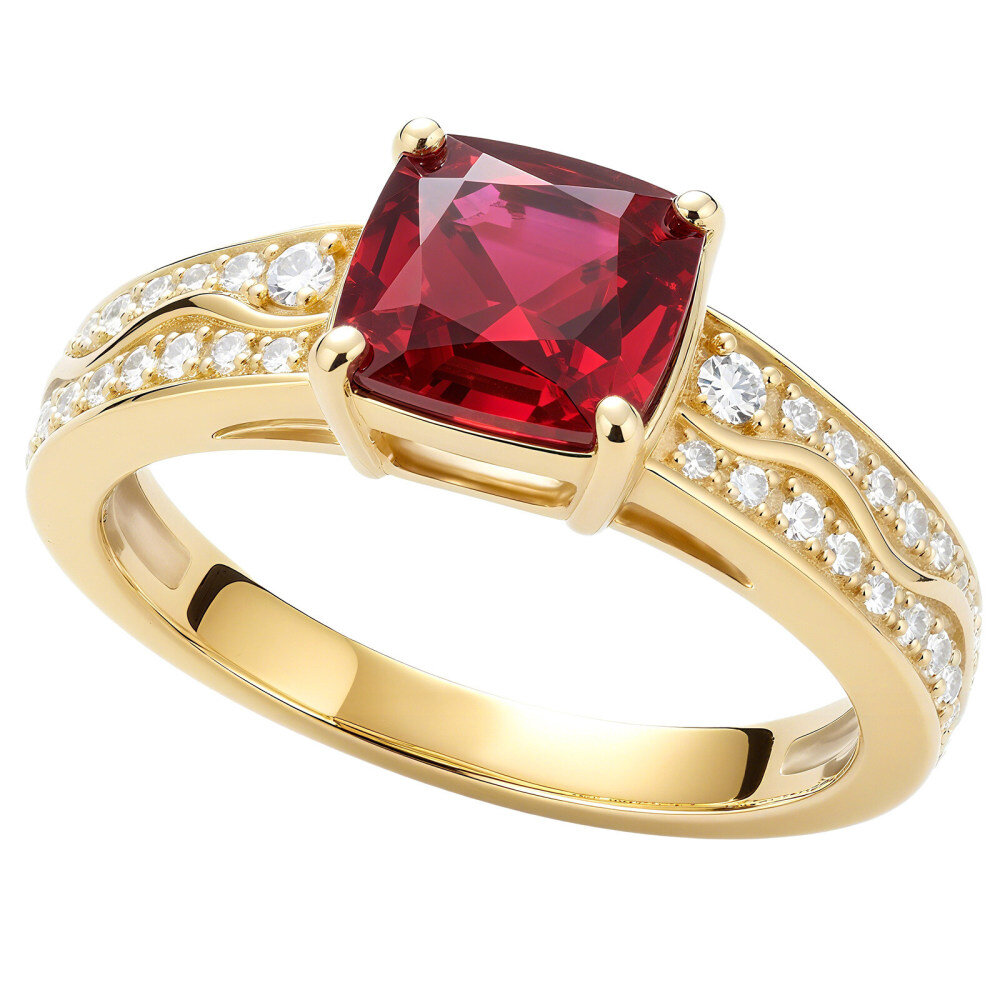Odkryj ponadczasową elegancję naszego pierścionka zaręczynowego z rubinem w kształcie poduszki i diamentami stworzonymi w laboratorium, wykonanego wyłącznie dla kobiet ceniących idealne połączenie luksusu i artystyczności, wykonanego ze 10-karatowego złota.