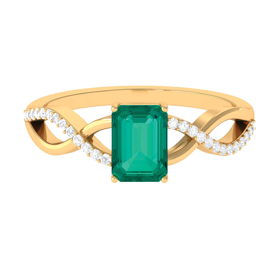 Odkryj elegancję z naszym oszałamiającym 10-karatowym złotym pierścionkiem zaręczynowym dla kobiet, z zapierającym dech w piersiach dużym szmaragdem stworzonym w laboratorium w centrum, otoczonym błyszczącymi diamentami stworzonymi w laboratorium. Ten starannie wykonany pierścionek charakteryzuje się wyjątkowym polerowaniem, szlifem i symetrią, dzięki czemu przyciąga uwagę każdym błyskiem.