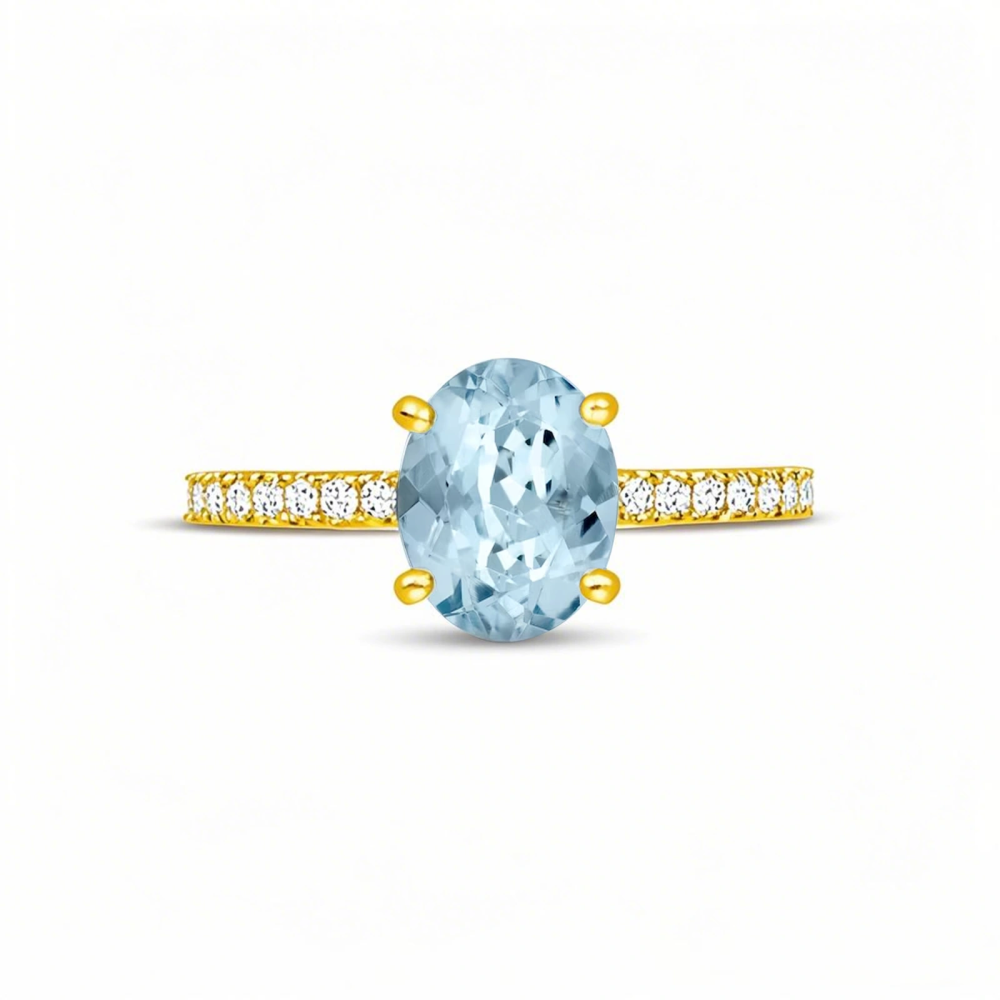Podnieś poziom swojej historii miłosnej dzięki naszemu oszałamiającemu 10-karatowemu złotemu pierścionkowi zaręczynowemu z zapierającym dech w piersiach dużym centralnym kamieniem akwamarynu, który symbolizuje spokój i ciszę. Idealnie zaprojektowany dla kobiet ceniących elegancję, ten wykwintny pierścionek jest ozdobiony błyszczącymi bocznymi kamieniami Moissanite, co daje łączną wagę 1,5 CT. T.W., co czyni go olśniewającym wyborem na Twój wyjątkowy moment.
