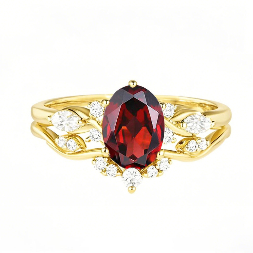 Odkryj nasz wykwintny 10-karatowy złoty zestaw ślubny, starannie zaprojektowany dla nowoczesnej kobiety, która szuka elegancji i luksusu. Ten zestaw z oszałamiającym rubinowym kamieniem centralnym jest pięknie uzupełniony o diamenty wytworzone w laboratorium (0,15 CT), które charakteryzują się wyjątkowym polerowaniem, szlifem i symetrią, zapewniając urzekający blask. Dzięki kolorowi diamentu sklasyfikowanemu jako D i czystości VVS, ten ponadczasowy zestaw emanuje wyrafinowaniem, czyniąc go idealnym symbolem miłości i zaangażowania na Twój wyjątkowy dzień. Podnieś swój wygląd ślubny dzięki temu niezwykłemu zestawowi, który łączy klasyczne piękno ze współczesnym rzemiosłem.