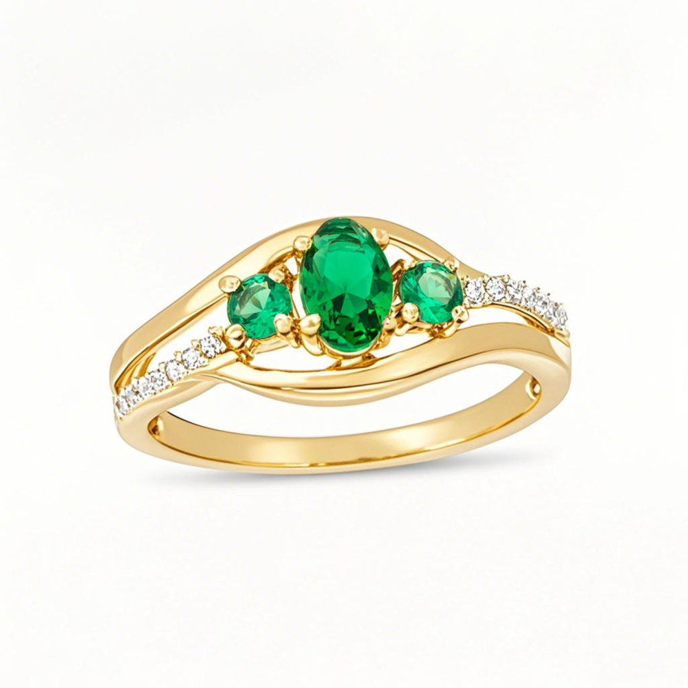 Podnieś rangę swojej propozycji dzięki naszemu oszałamiającemu pierścionkowi zaręczynowemu ze złota próby 10K, z wykwintnym wzorem Three-Stone. Centralnym elementem jest uderzający szmaragd Lab Created, otoczony olśniewającymi diamentami o wyjątkowym kolorze i przejrzystości — co czyni go idealnym symbolem trwałej miłości dla współczesnej kobiety.