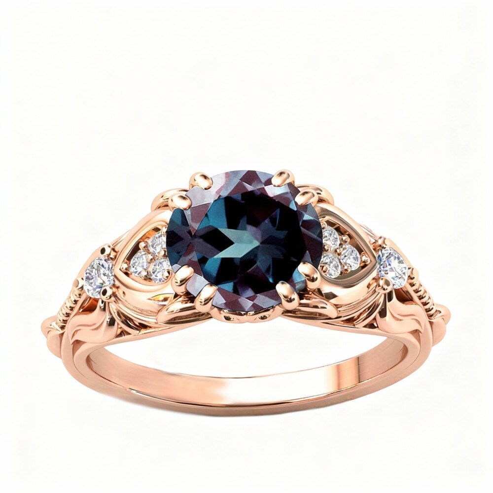 Wykonany z najwyższej jakości 10-karatowego złota, ten pierścionek zaręczynowy prezentuje uderzający centralny kamień aleksandryt, który pięknie zmienia kolor w różnym oświetleniu, symbolizując transformacyjną moc miłości. Styl vintage pierścionka dodaje ponadczasowego akcentu, podczas gdy boczne kamienie moissanitu zapewniają dodatkowy blask, reprezentując blask i trwałość waszego związku. Ten niestandardowy element jest idealny dla kobiet poszukujących wyjątkowego pierścionka zaręczynowego, który uchwyci zarówno piękno, jak i indywidualność.
