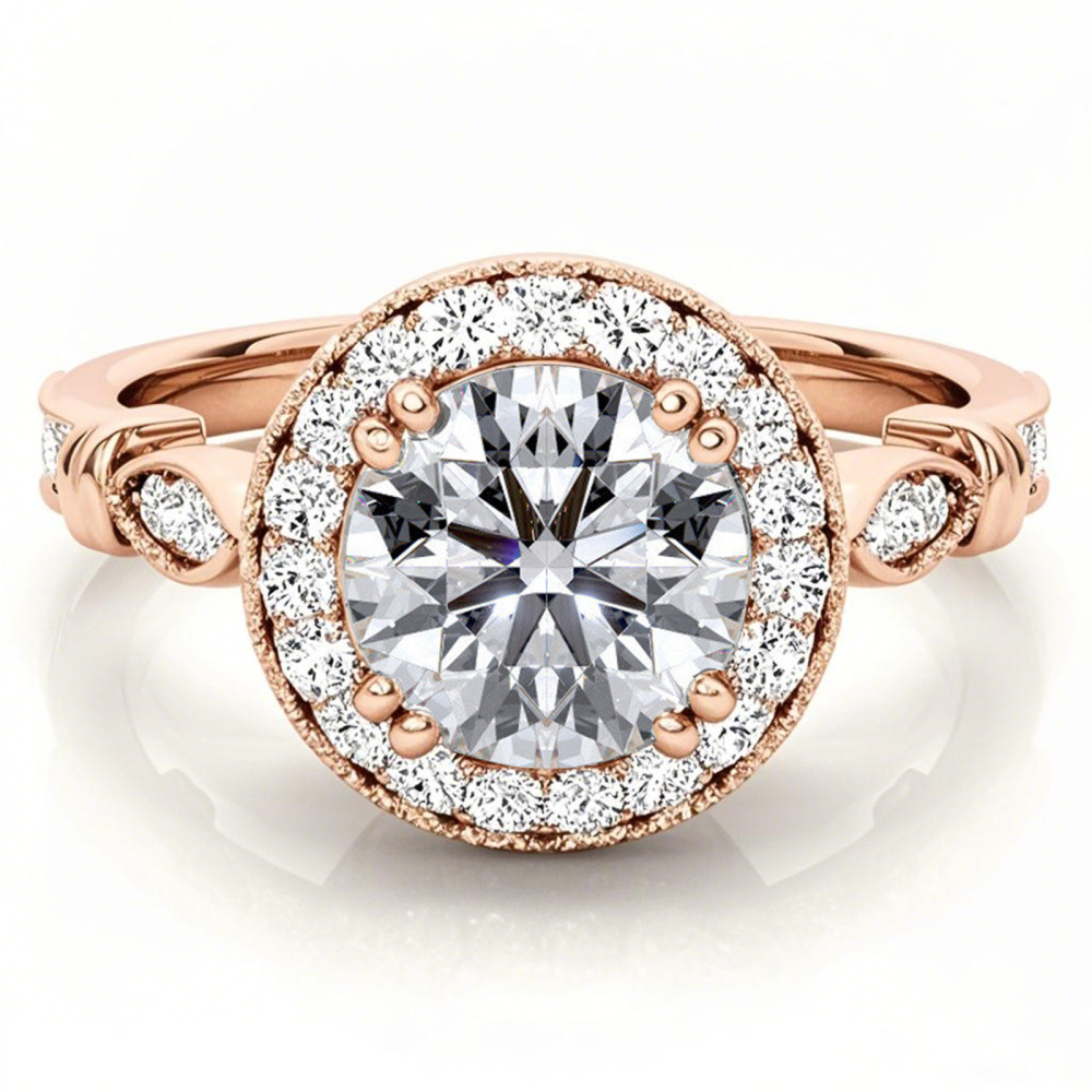 Zanurz się w luksusie z naszym wykwintnym pierścionkiem zaręczynowym w stylu vintage, wykonanym z 10-karatowego różowego złota i ozdobionym oszałamiającym kamieniem centralnym moissanite, dzięki czemu Twoja miłość będzie lśnić tak samo jasno, jak Twoje zaangażowanie. Dzięki wyjątkowemu polerowaniu, szlifowi i symetrii ten zapierający dech w piersiach pierścionek uosabia elegancję, szczycąc się całkowitą wagą od 1 do 5 CT i błyszczącymi kamieniami bocznymi, które podkreślają jego ponadczasowe piękno.