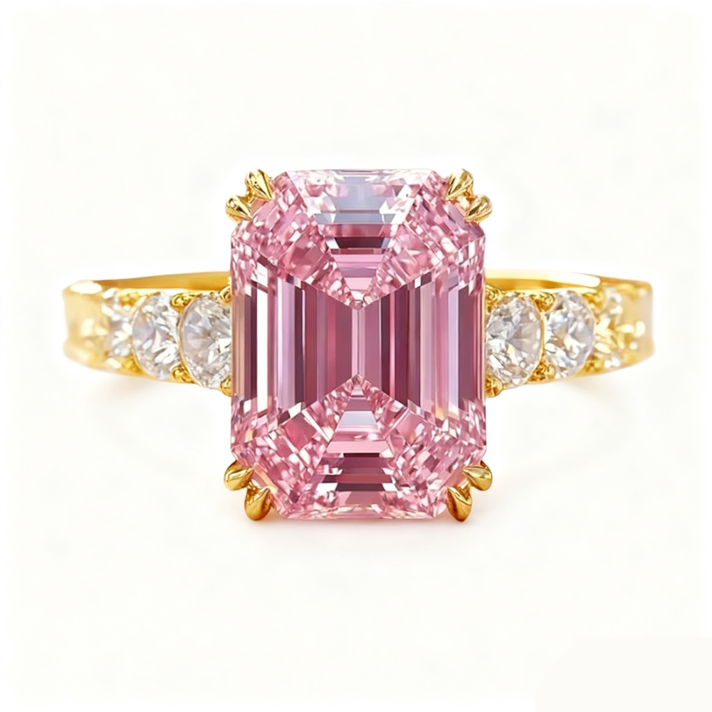 Wykonany z wysokiej jakości 14-karatowego złota, ten pierścionek zaręczynowy ma olśniewający 3-karatowy moissanitowy kamień centralny, oferujący niesamowity blask i ogień porównywalny z diamentami. Wzór halo jest pięknie uzupełniony 0,5 CT mieniących się kamieni bocznych, tworzących urzekający blask z każdej strony. Dzięki imponującej łącznej wadze 2,5 CT ten pierścionek jest oszałamiającym przedstawieniem historii Twojej miłości, idealnym dla nowoczesnej kobiety poszukującej zarówno piękna, jak i wyrafinowania w swojej kolekcji biżuterii.
