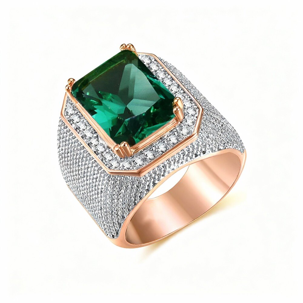 Odkryj naszą oszałamiającą obrączkę ślubną z 14-karatowego złota zaprojektowaną dla mężczyzn, z urzekającym dużym kamieniem centralnym z laboratoryjnie stworzonego szmaragdu i błyszczącymi kamieniami bocznymi z moissanitu. Starannie wykonany z doskonałym polerowaniem, szlifem i symetrią, ten pierścionek nie tylko symbolizuje wieczną miłość, ale także prezentuje wyjątkowe połączenie elegancji i wyrafinowania, co czyni go idealnym wyborem dla współczesnego pana młodego, który szuka wyjątkowej, ale ponadczasowej biżuterii.