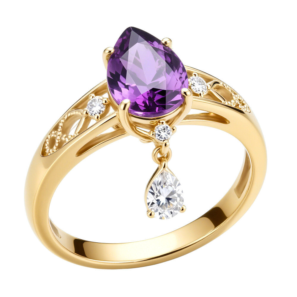 Odkryj wykwintny pierścionek zaręczynowy z ametystem i diamentami o formie gruszki, wykonany z 14-karatowego złota – zachwycający element stworzony dla nowoczesnej kobiety, która szuka elegancji i wyrafinowania.