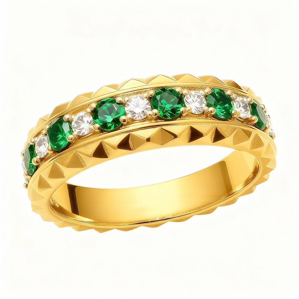 Crafted from high-quality 14K Gold, this wedding ring boasts a brilliant polish finish that ensures a lasting shine. The exemplary cut and symmetry highlight the ring's intricate design, while the vibrant emerald side stones enhance its luxurious appeal. Moissanite accents provide a captivating sparkle, making this ring the perfect symbol of commitment. Embrace a timeless elegance that complements every moment of your journey together, ensuring you feel cherished every time you wear it.
