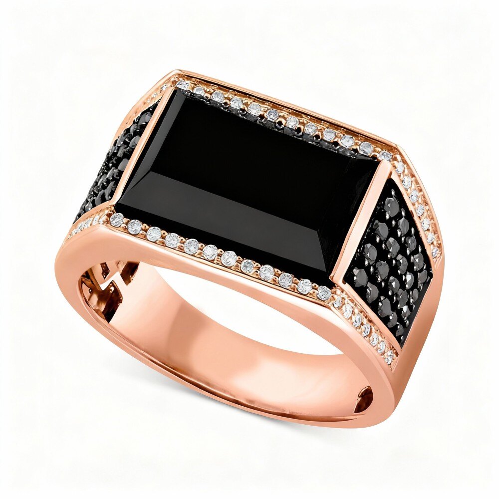 Odkryj nasz oszałamiający pierścionek zaręczynowy w złocie 18K zaprojektowany specjalnie dla mężczyzn, z niezwykłym centrum z onyxu, które emanuje elegancją i stylem.