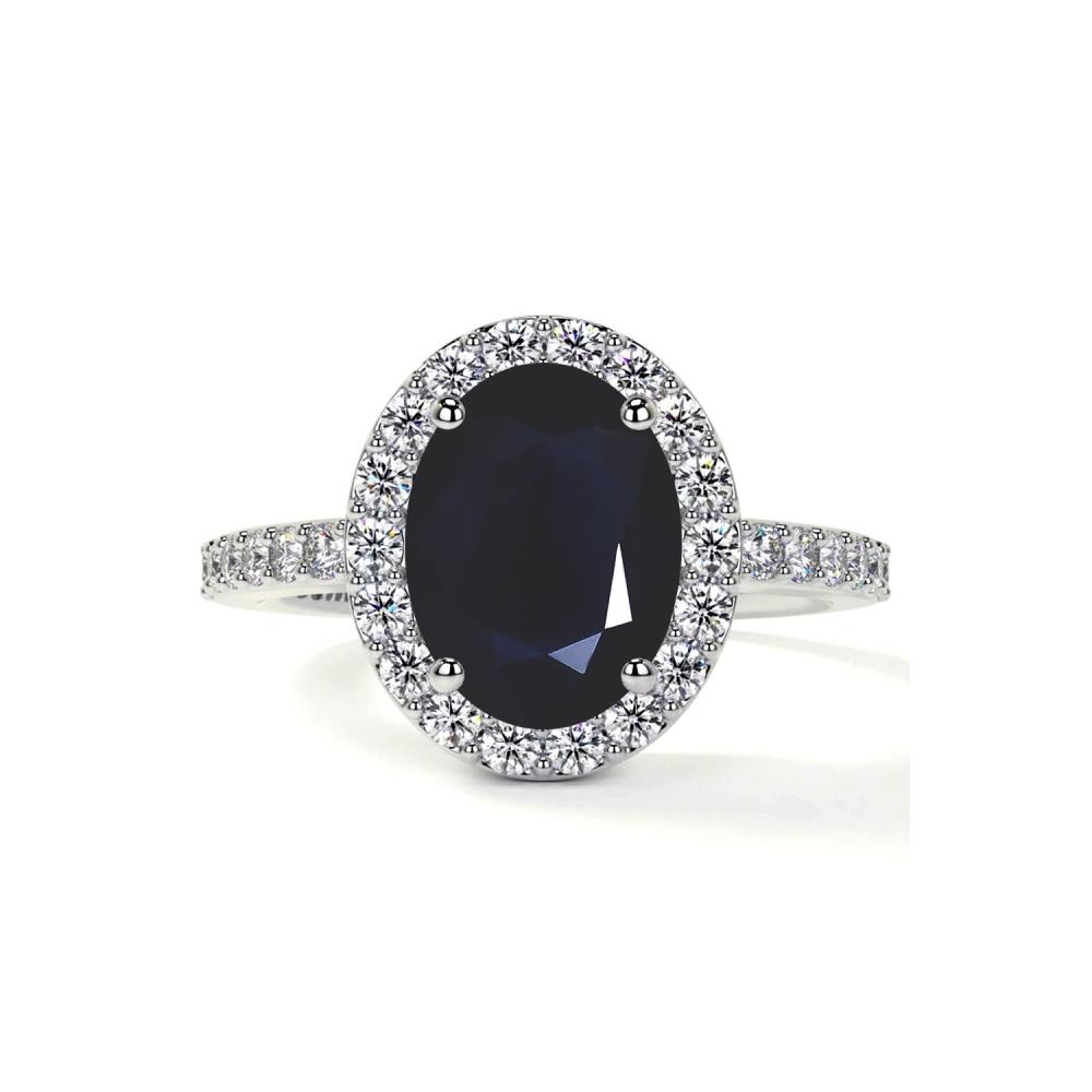 Odkryj kwintesencję elegancji z naszym wykwintnym pierścionkiem zaręczynowym z 18-karatowego złota, zaprojektowanym dla nowoczesnej kobiety, która ceni sobie kunszt wykonania i ponadczasowe piękno. Ten pierścionek o oszałamiającym stylu halo ozdobiony błyszczącym szafirowym kamieniem centralnym o wadze 0,5 karata i błyszczącymi kamieniami bocznymi z moissanitu uosabia idealne połączenie luksusu i indywidualności, dzięki czemu jest idealnym symbolem Twojej miłości.