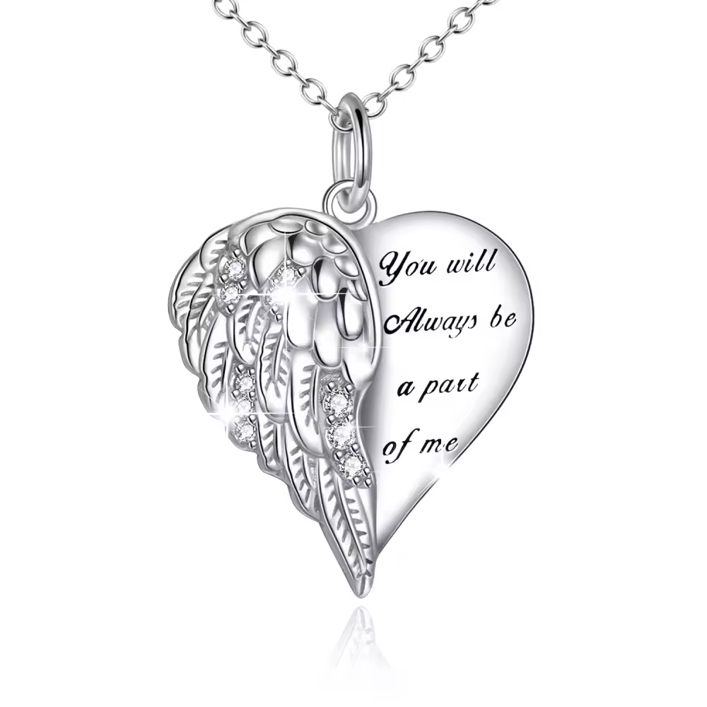 Podnieś swoją elegancję dzięki naszemu oszałamiającemu naszyjnikowi ze srebra próby 925, z okrągłą cyrkonią osadzoną w wykwintnym wzorze skrzydła anioła i serca, pokrytym białym złotem. Ten urzekający naszyjnik z napisem "You Will Always Be A Part Of Me" to idealny prezent dla wyjątkowej kobiety w Twoim życiu.